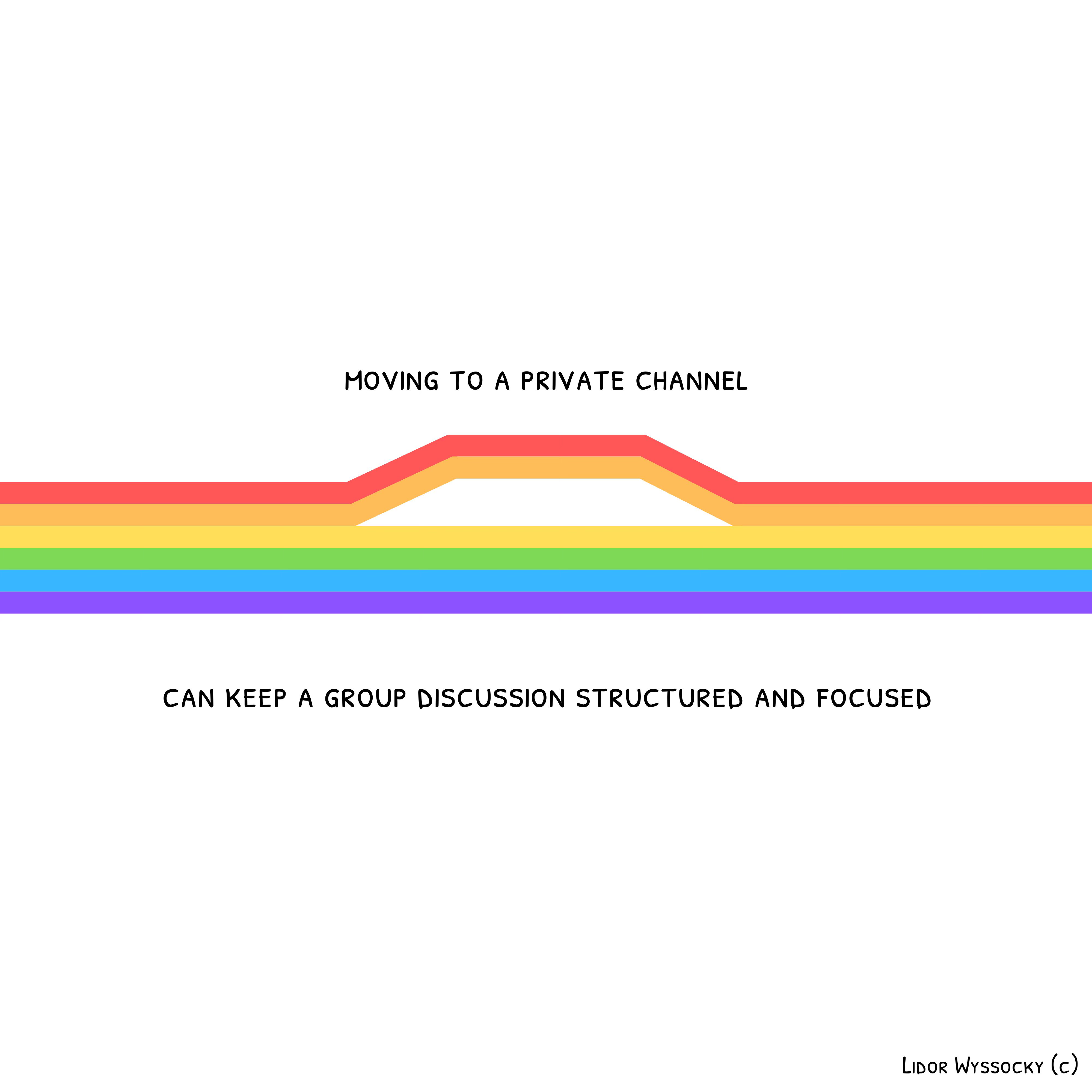 If you need to verify something with one participant, move to a private channel. You can have as many iterations as you need without cluttering the group chat. Once you and your colleague conclude your side discussion, you can return to the group chat and share your insights.
